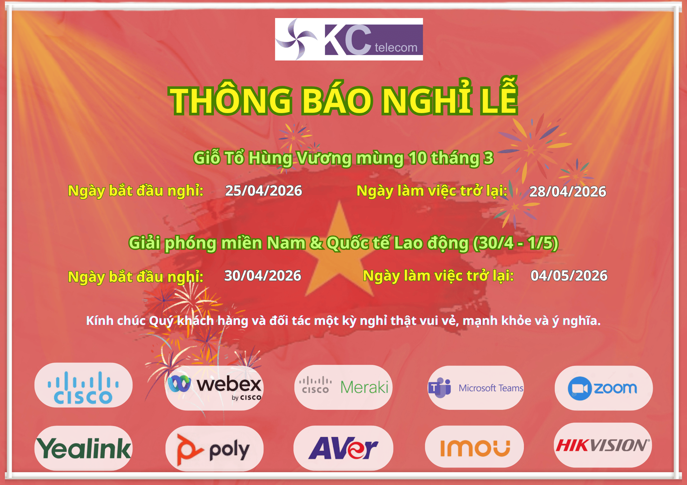 Công ty TNHH Thương mại và Dịch vụ Viễn thông Kim Cát xin trân trọng thông báo lịch nghỉ lễ nhân dịp Giỗ Tổ Hùng Vương (mùng 10 tháng 3 âm lịch), Ngày Giải phóng miền Nam (30/4) & Ngày Quốc tế Lao động (1/5) như sau: