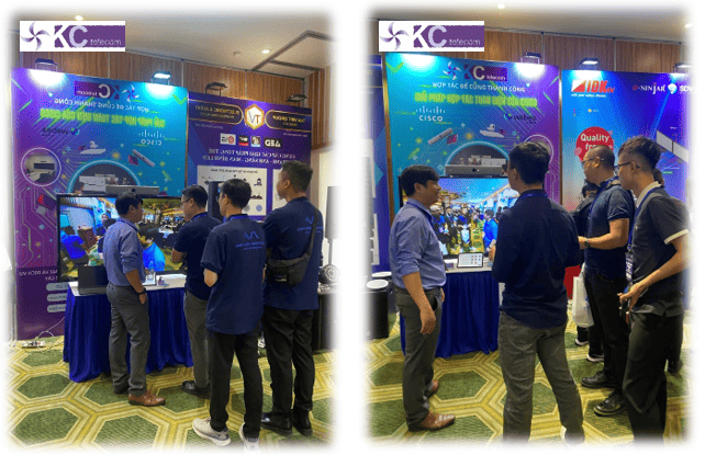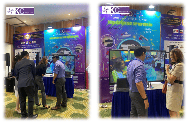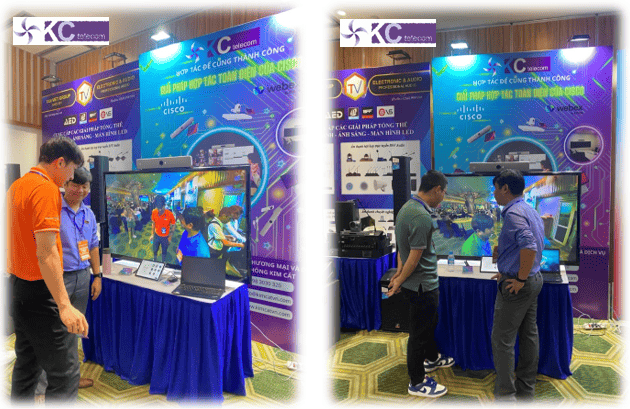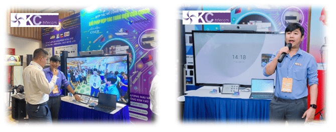 Tại sự kiện, gian hàng Kim Cát Telecom đã giới thiệu đến khách tham quan những giải pháp hội nghị truyền hình thông minh, nổi bật là thiết bị Cisco Room Bar – giải pháp “all in one” tích hợp camera 4K, micro array và loa chất lượng cao, mang đến trải nghiệm hình ảnh sắc nét, âm thanh chân thực, cùng tính năng AI thông minh hỗ trợ tự động tối ưu hóa khung hình và không gian họp.
